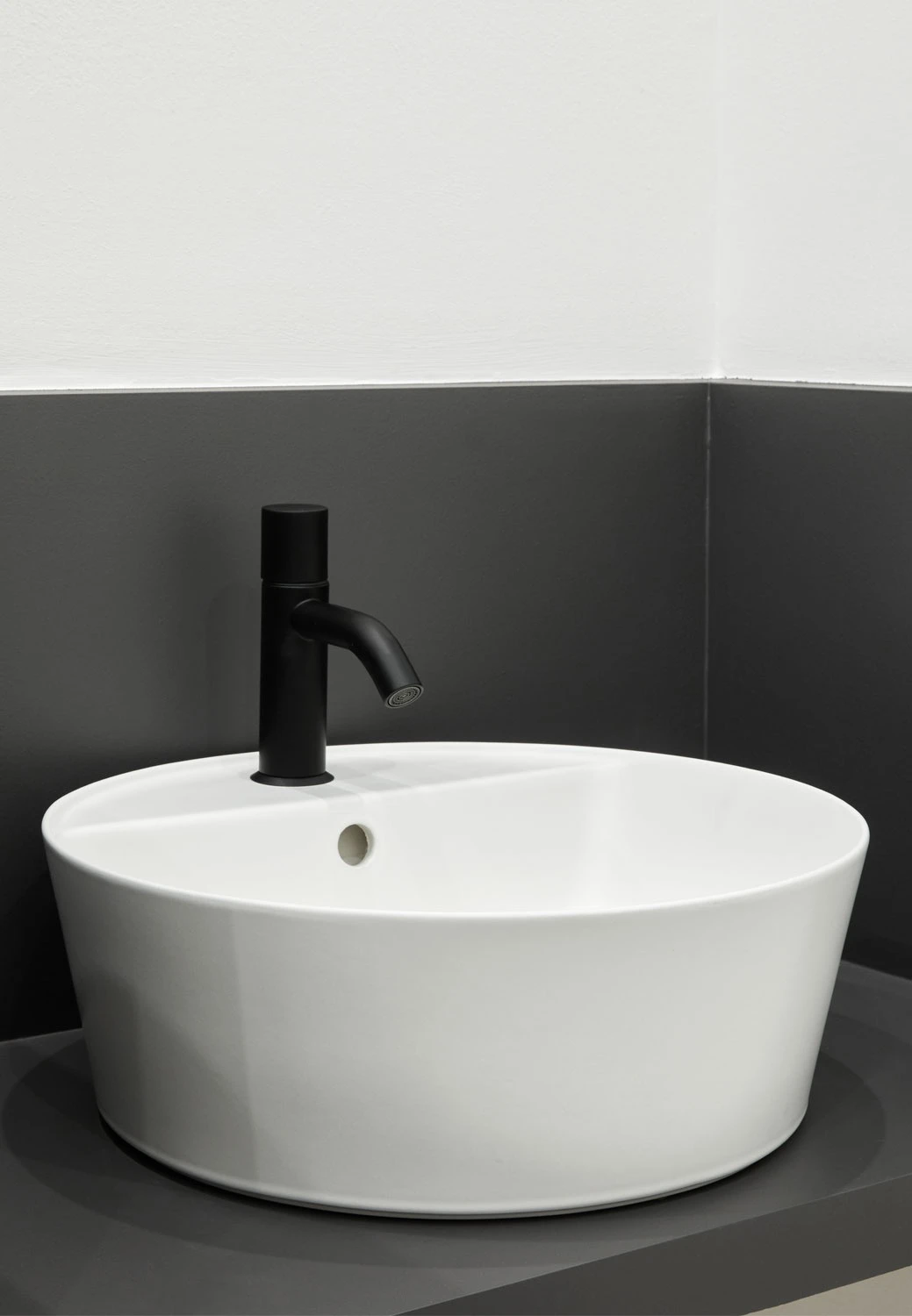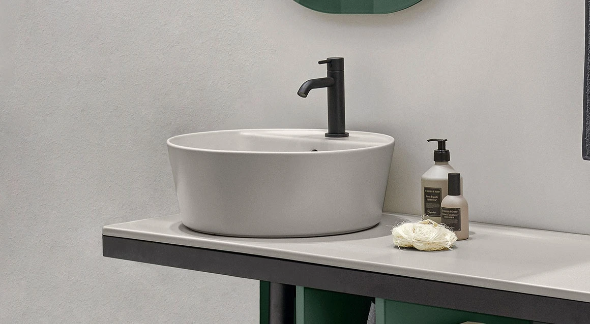 Bacinella da appoggio, rifinita su tutti i lati, con piano di appoggio monoforo. Disponibile in varie finiture ceramiche.
