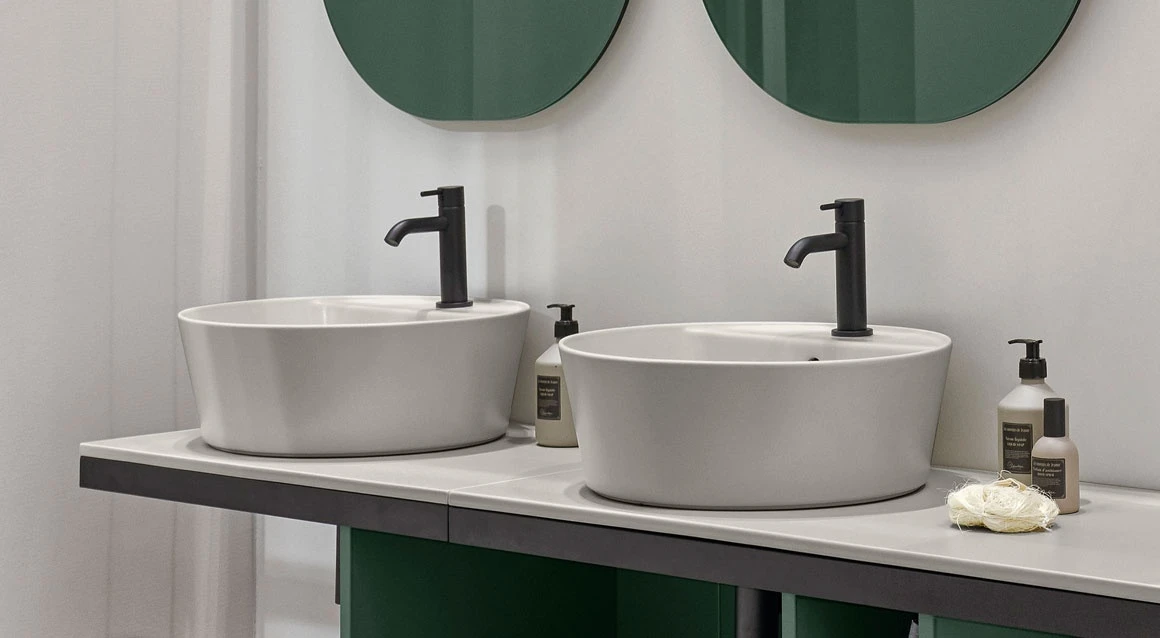 Bacinella Handy da appoggio, rifinita su tutti i lati, con piano di appoggio monoforo. Disponibile in varie finiture ceramiche.