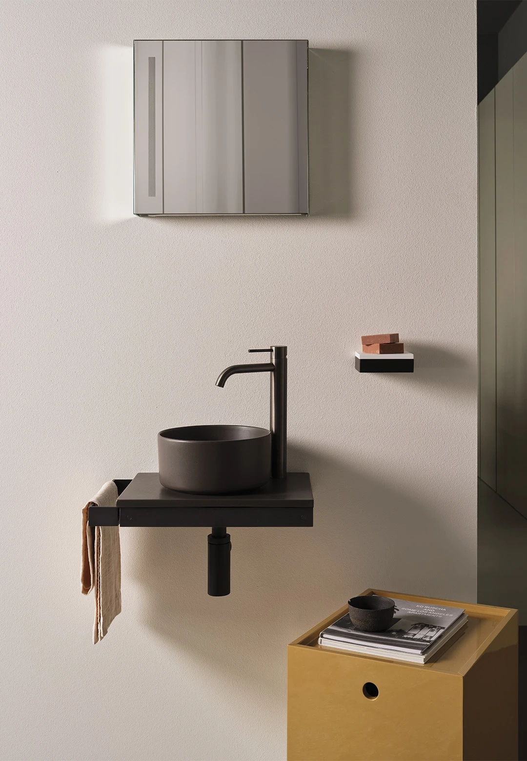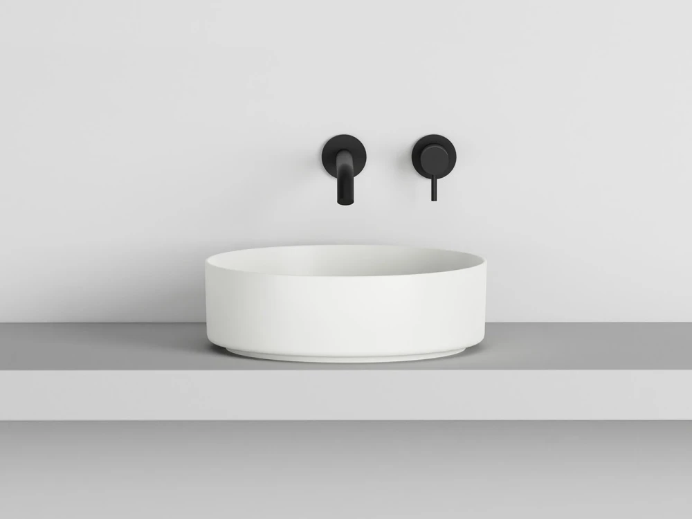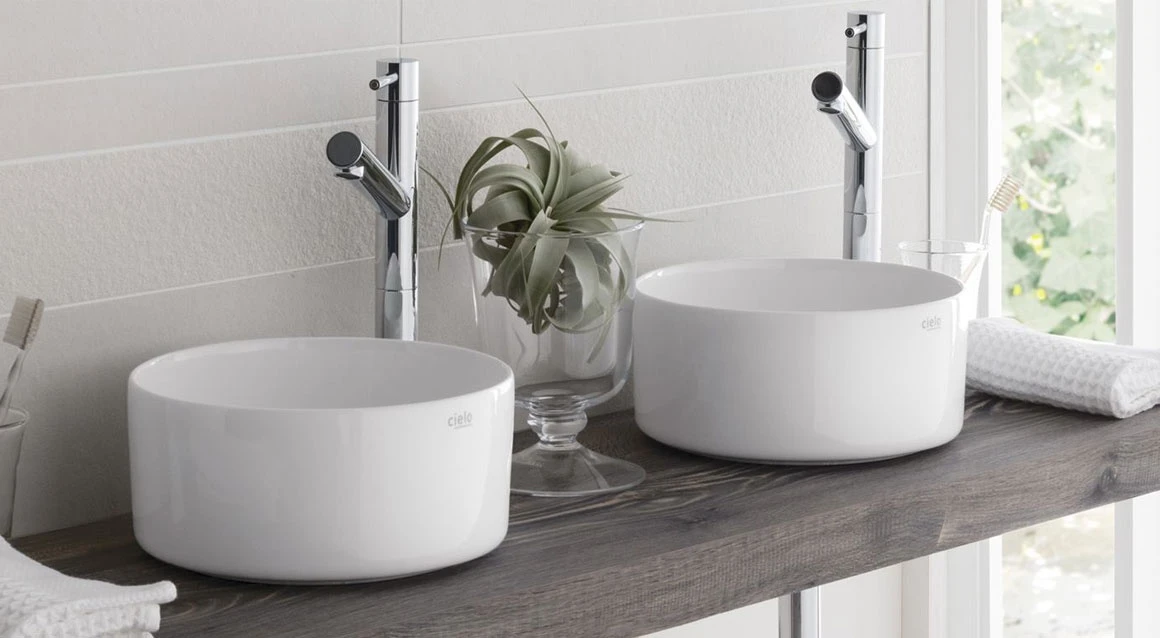Lavabo da appoggio senza troppo pieno, rifinito su tutti i lati. Disponibile in varie finiture ceramiche.