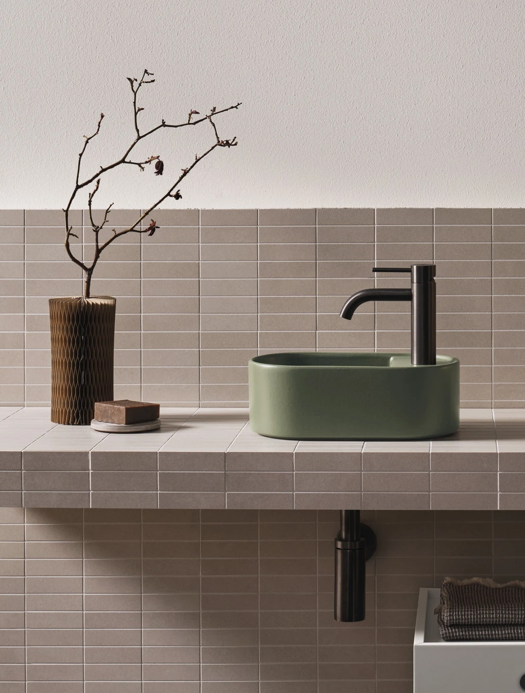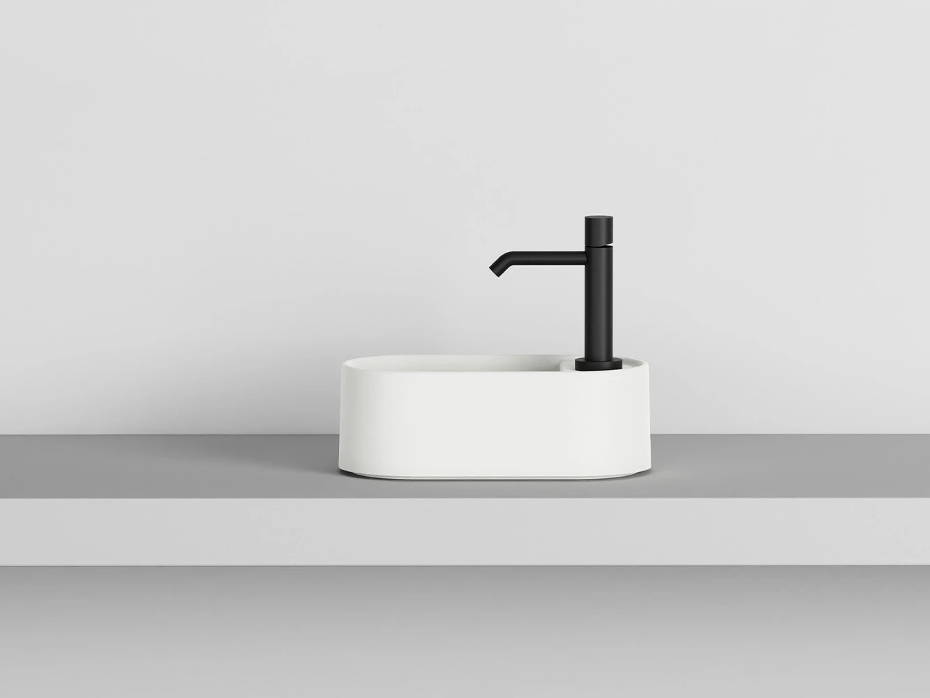 Lavabo da appoggio monoforo senza troppo pieno, rifinito su tutti i lati. Disponibile in varie finiture ceramiche.