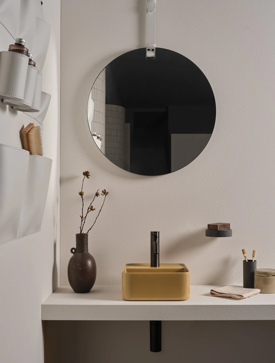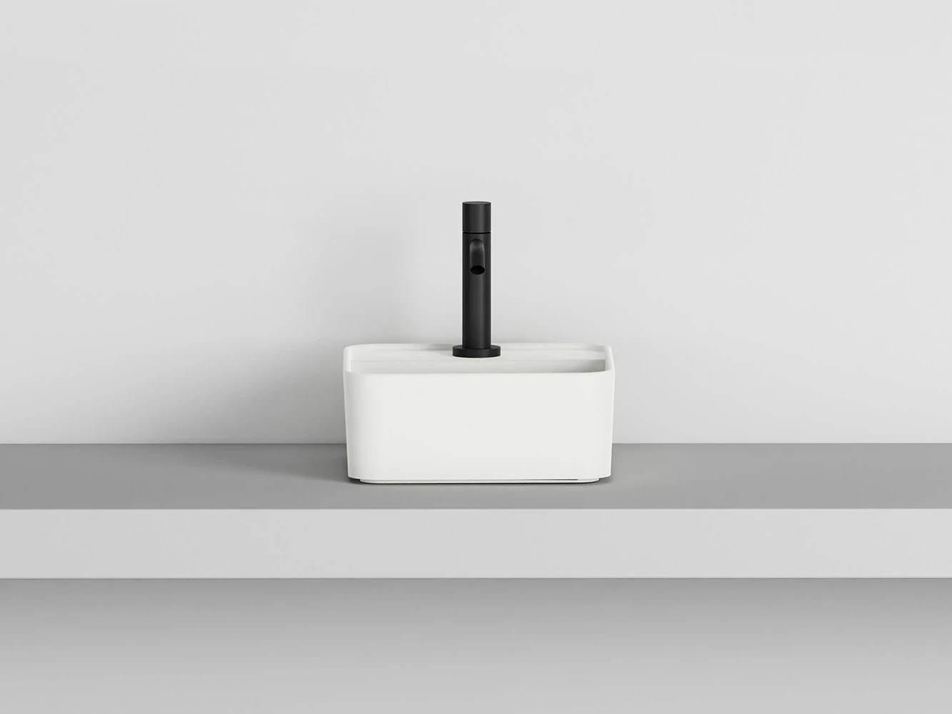 Lavabo da appoggio con foro rubinetto senza troppo pieno, con un lato non smaltato. Disponibile in varie finiture ceramiche.