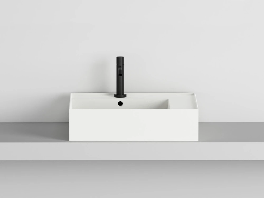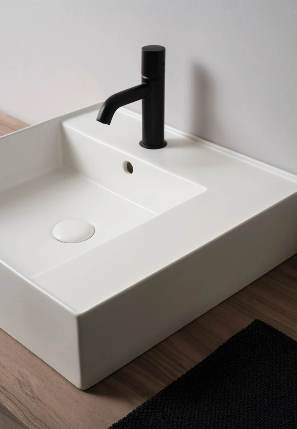 Lavabo con troppo pieno, per installazione sospesa o da appoggio, disponibile in varie finiture ceramiche.
