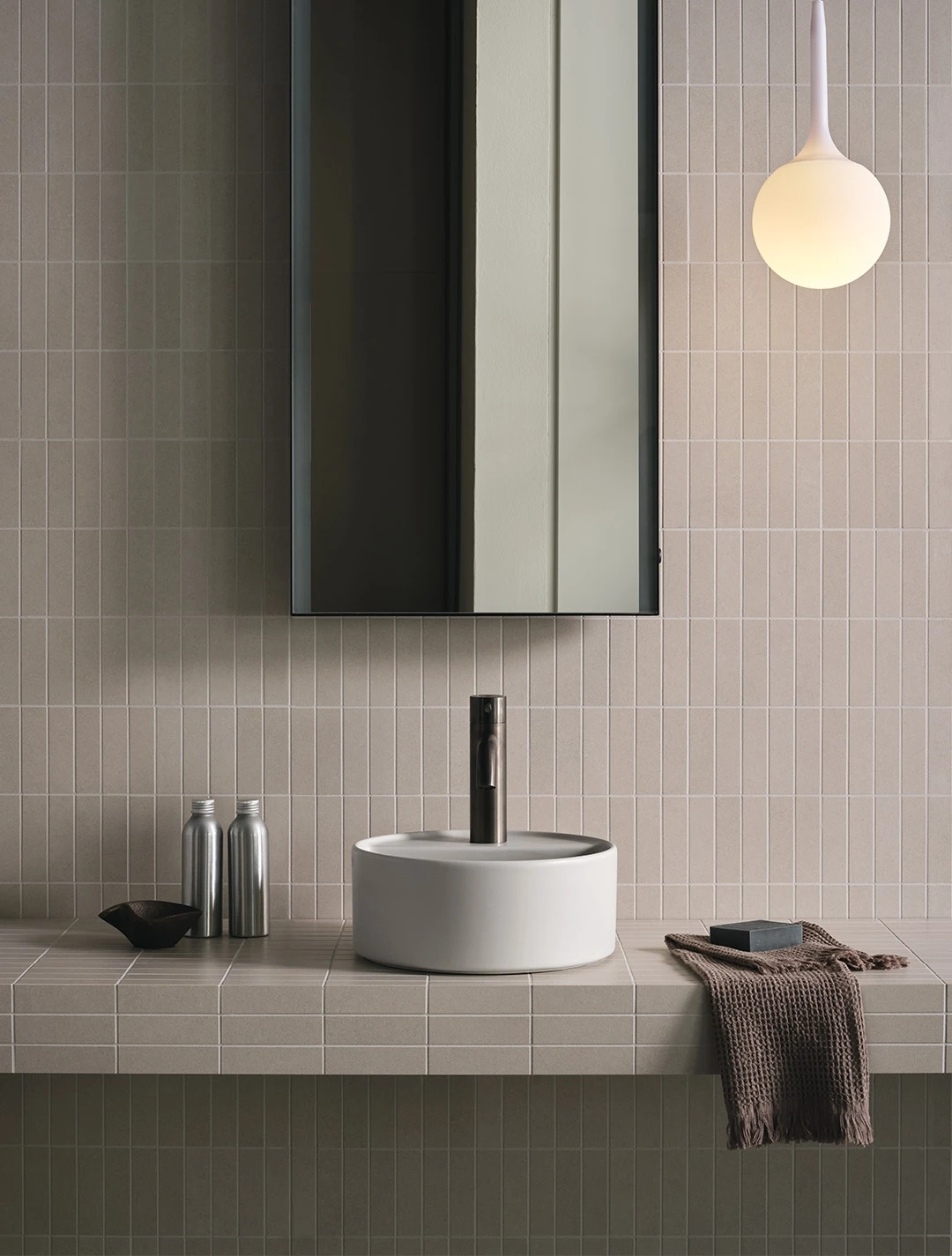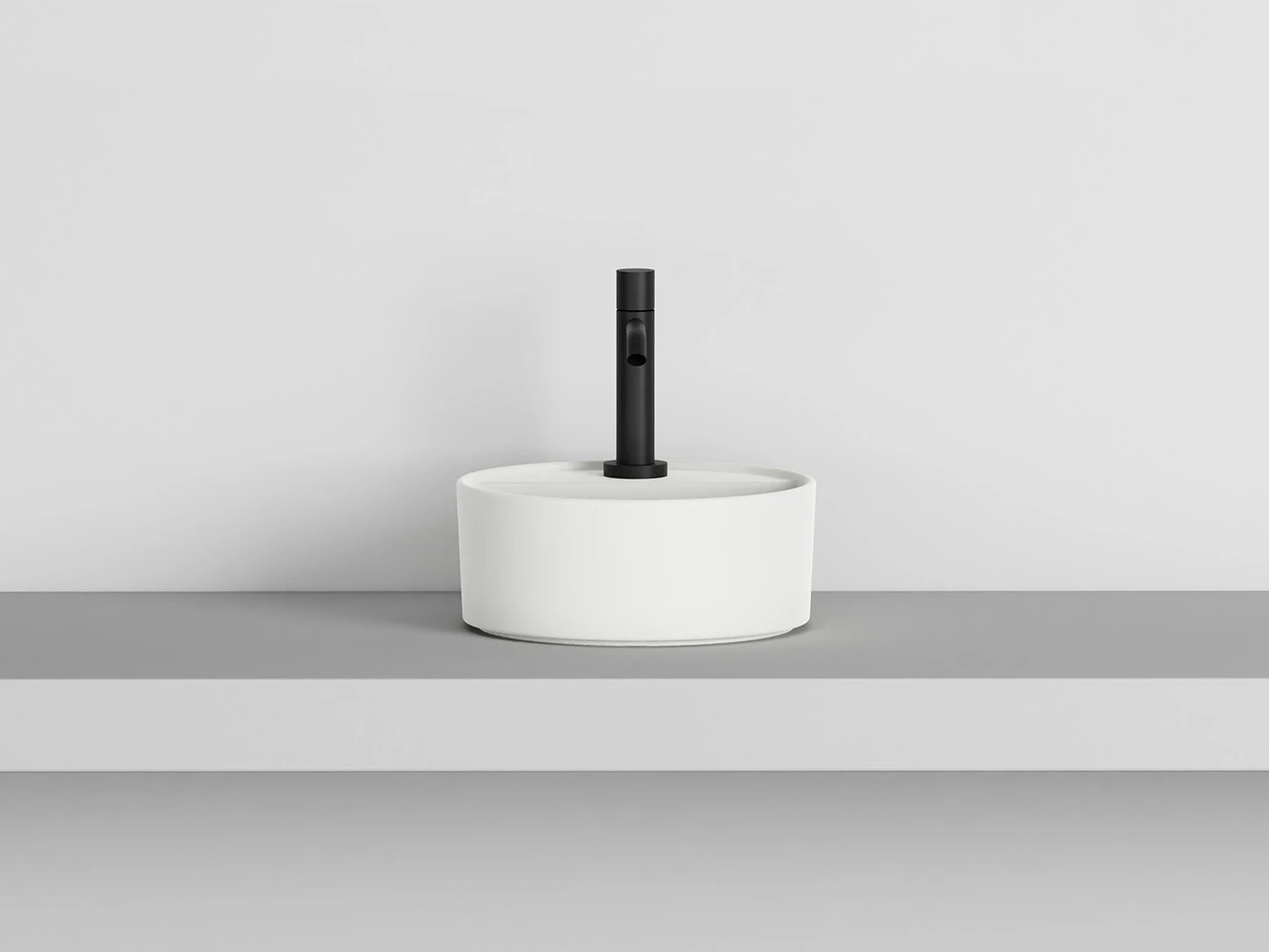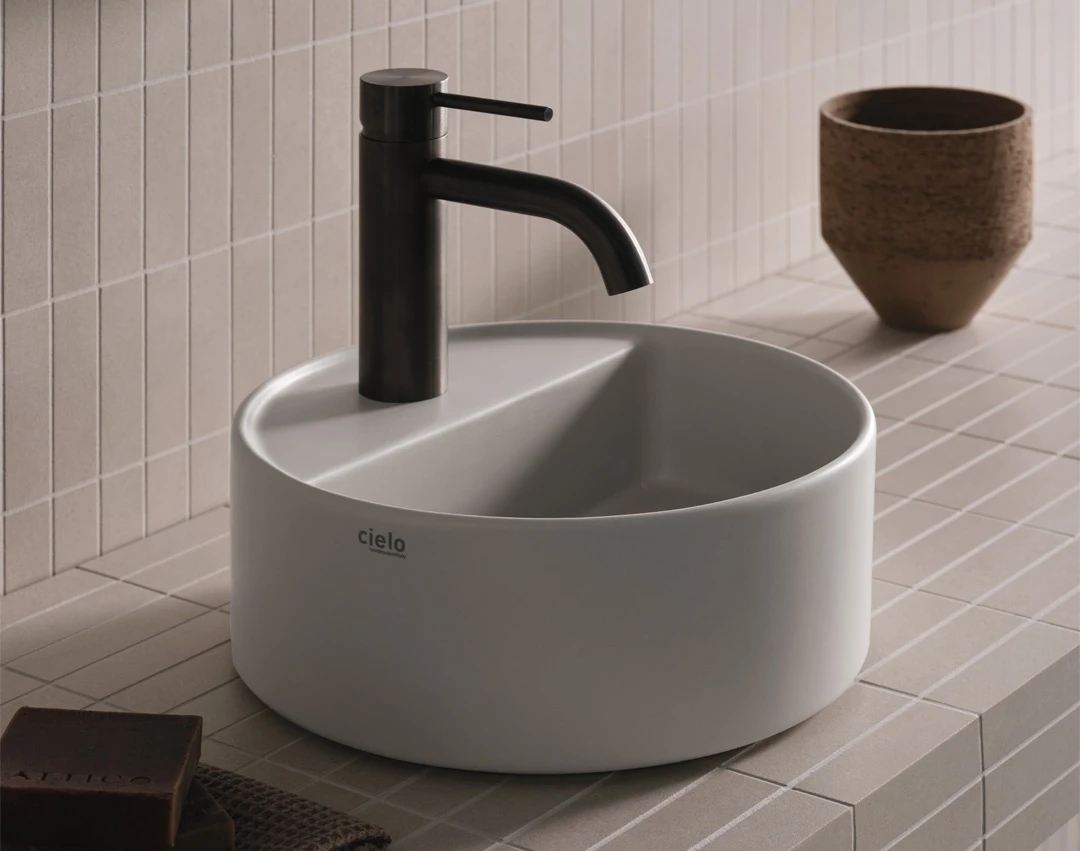 Lavabo da appoggio con foro rubinetto senza troppo pieno, rifinito su tutti i lati. Disponibile in varie finiture ceramiche.