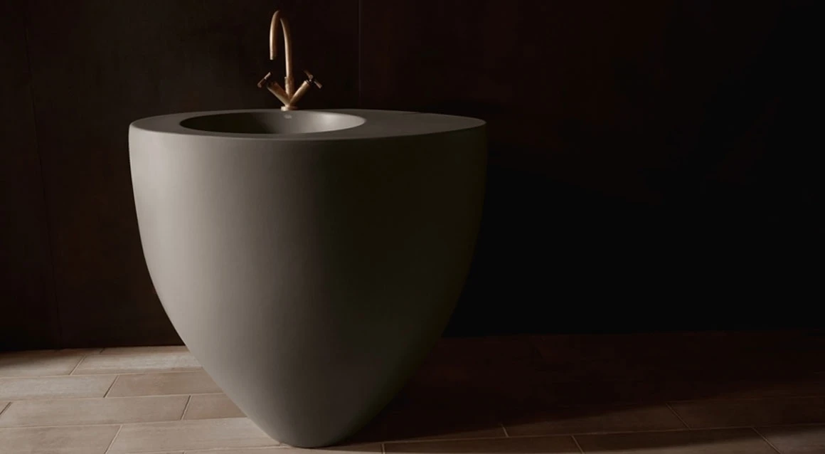 Lavabo freestanding con installazione a ridosso della parete. Disponibile in varie finiture ceramiche.