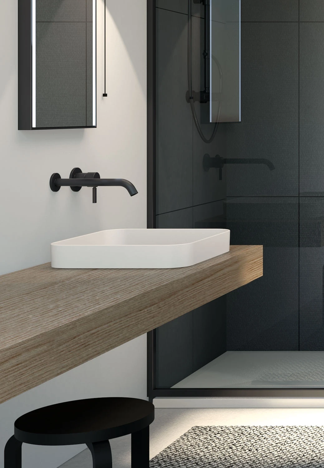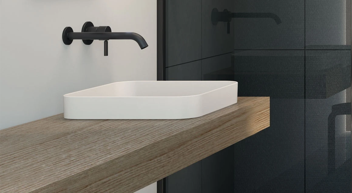Lavabo a semi-incasso, senza troppo pieno, disponibile in varie finiture ceramiche.