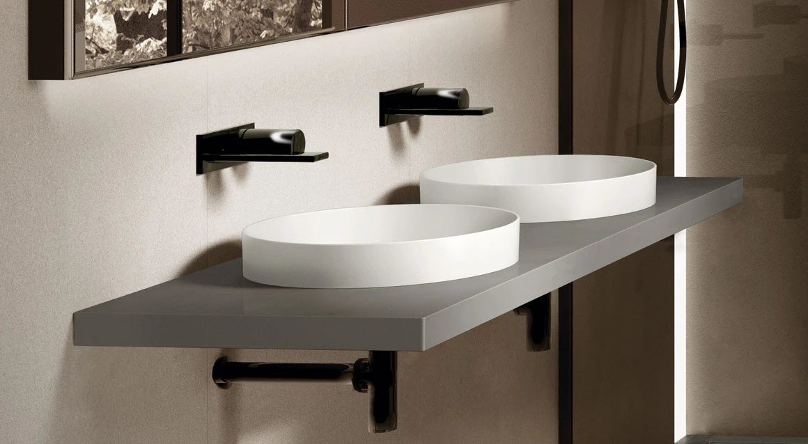 Lavabo a semi-incasso, disponibile in varie finiture ceramiche.