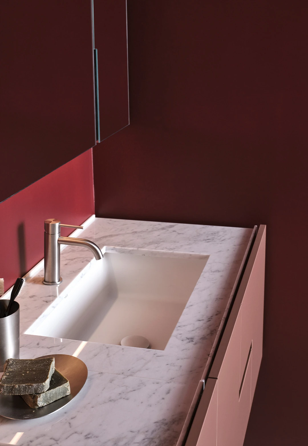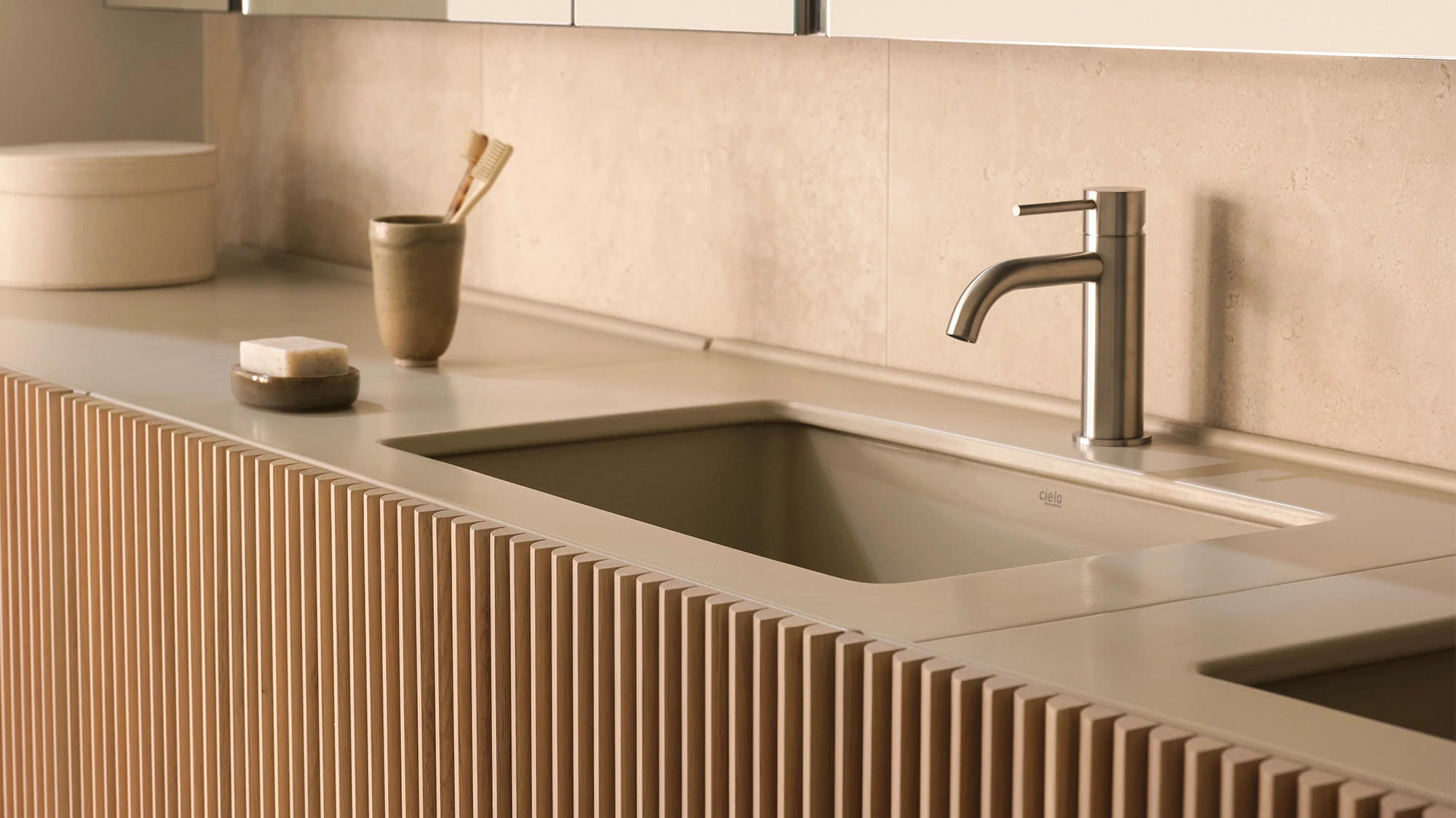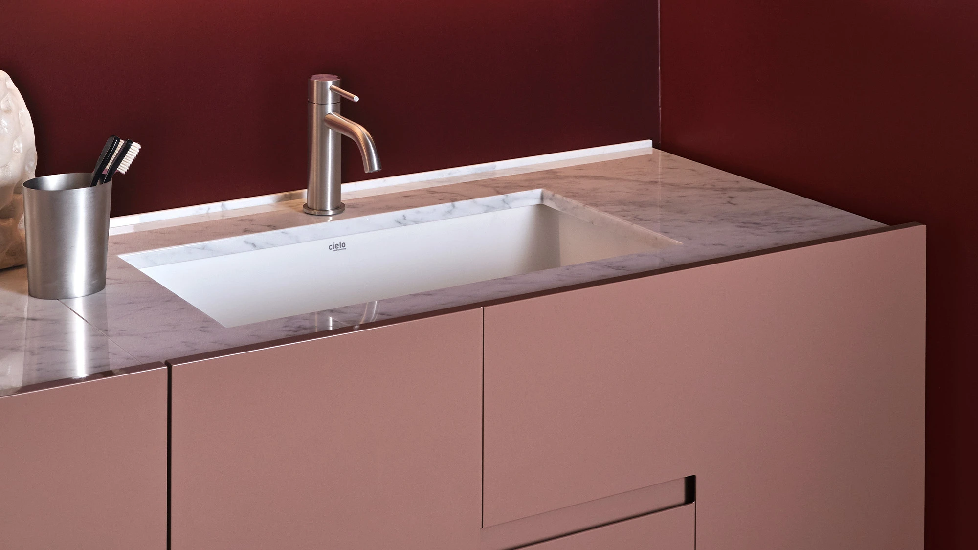 Lavabo sotto-piano, con troppo pieno, disponibile in varie finiture ceramiche.