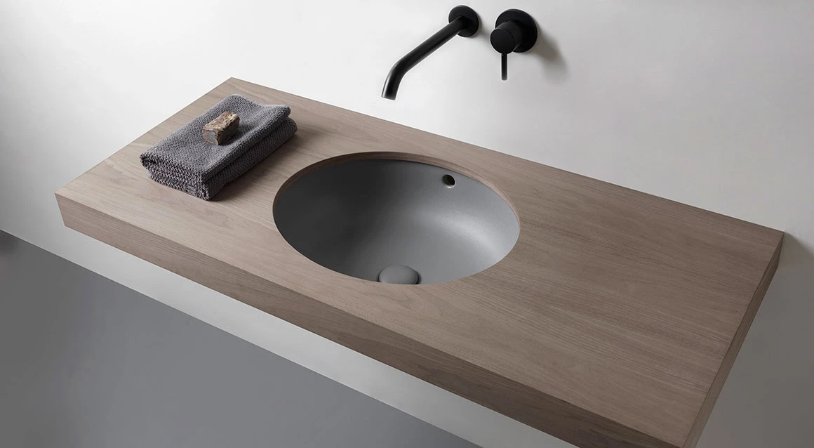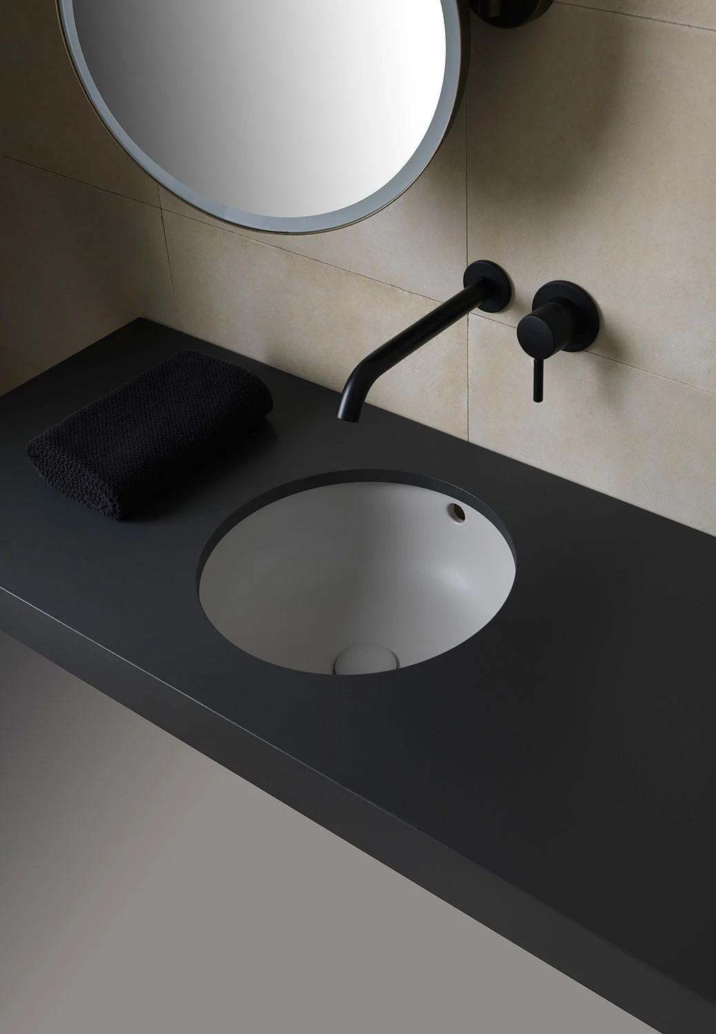 Lavabo sotto-piano, con troppo pieno, disponibile in varie finiture ceramiche.