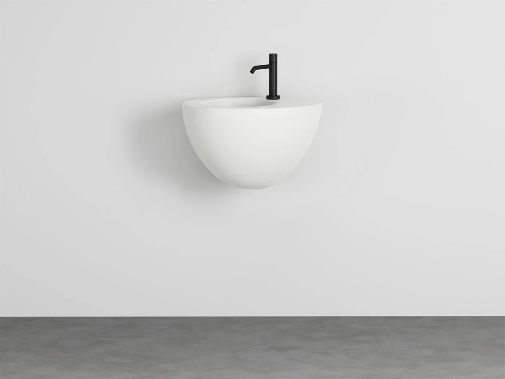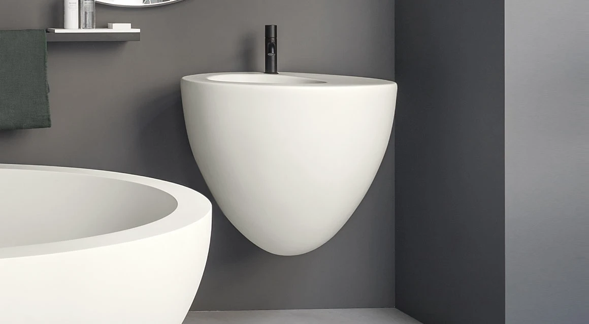 Lavabo a installazione sospesa, senza troppo pieno. Disponibile in varie finiture ceramiche.