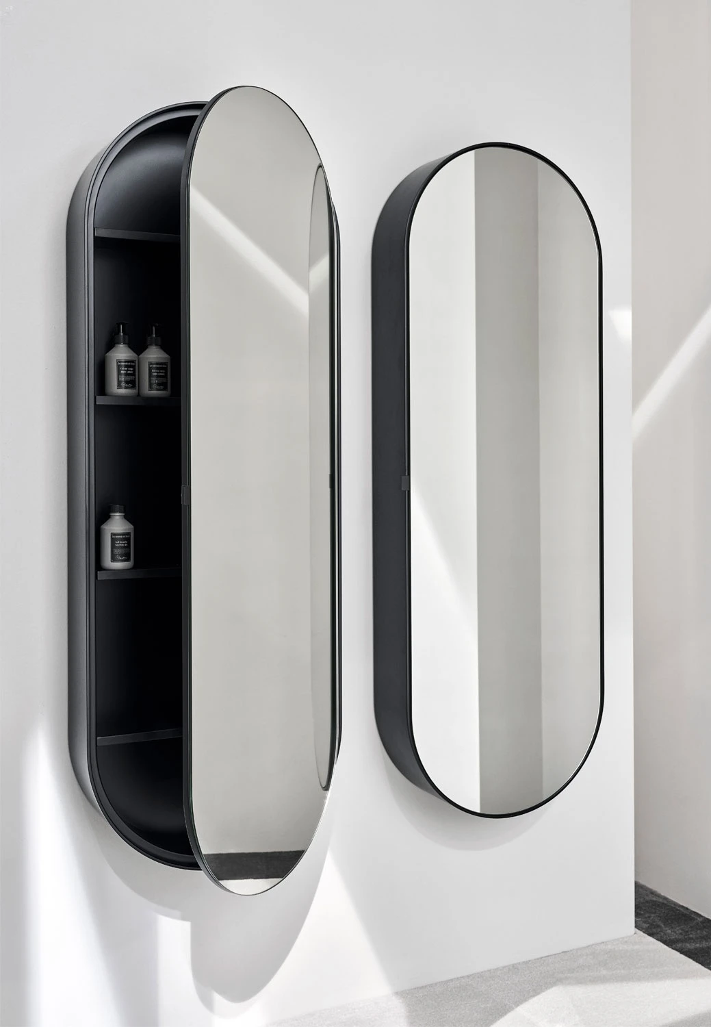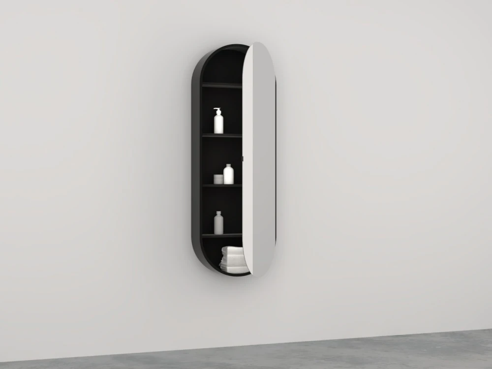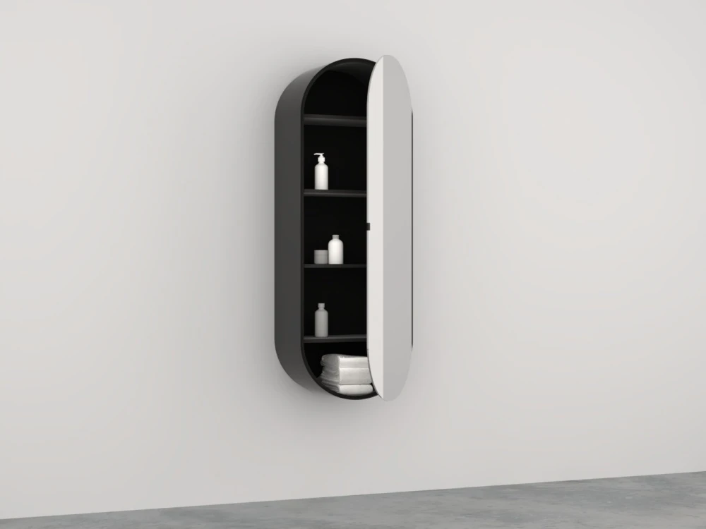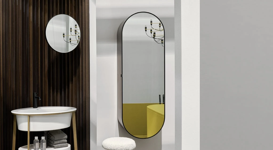Grande specchio contenitore ovale con scocca laccata. Possibilità di scelta con specchio bi-colore e disponibile in due profondità, Elio ed Elio Slim.