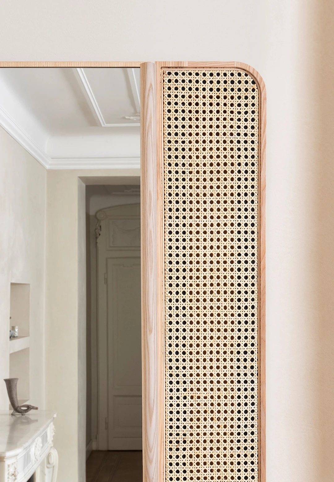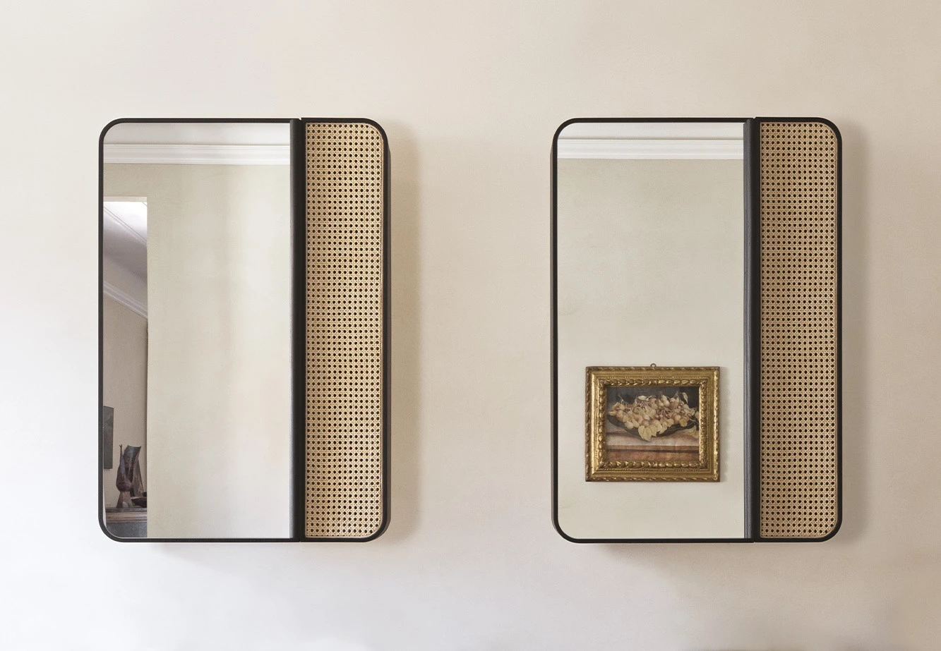 Specchio contenitore rettangolare, con doppia anta, con scocca in legno di frassino naturale o tinto nero e frontale anta destra in paglia di Vienna naturale