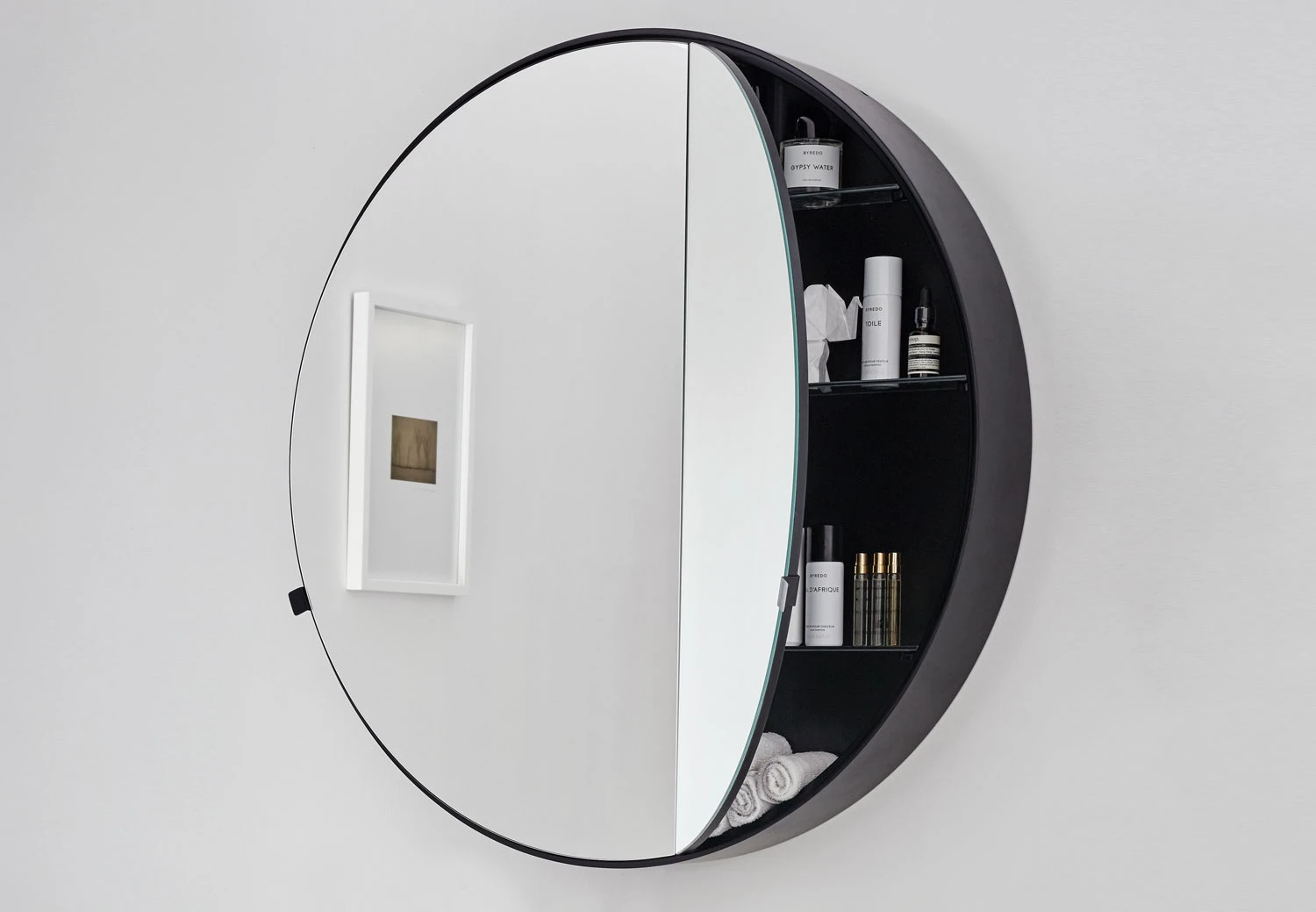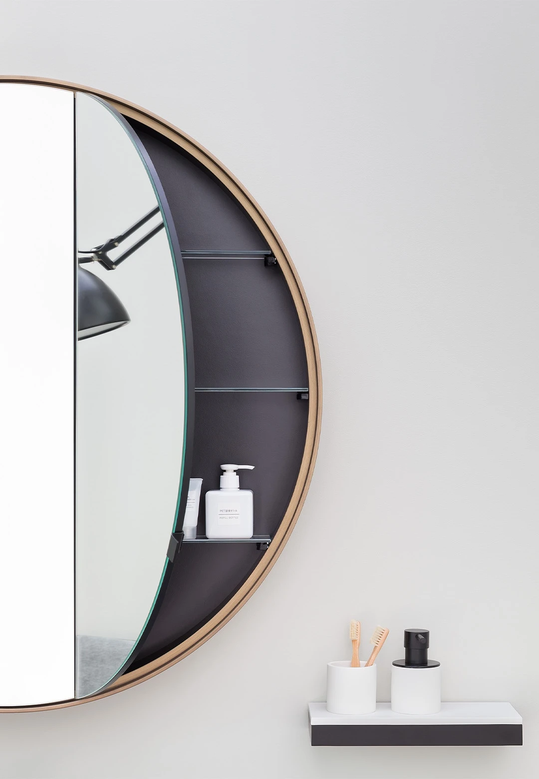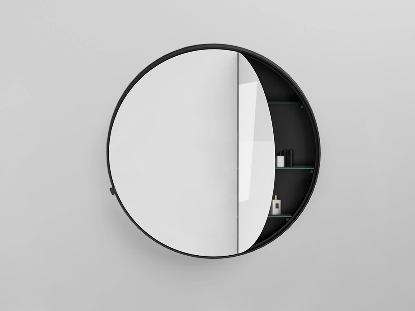 Specchio contenitore tondo a doppio scomparto con scocca laccata.