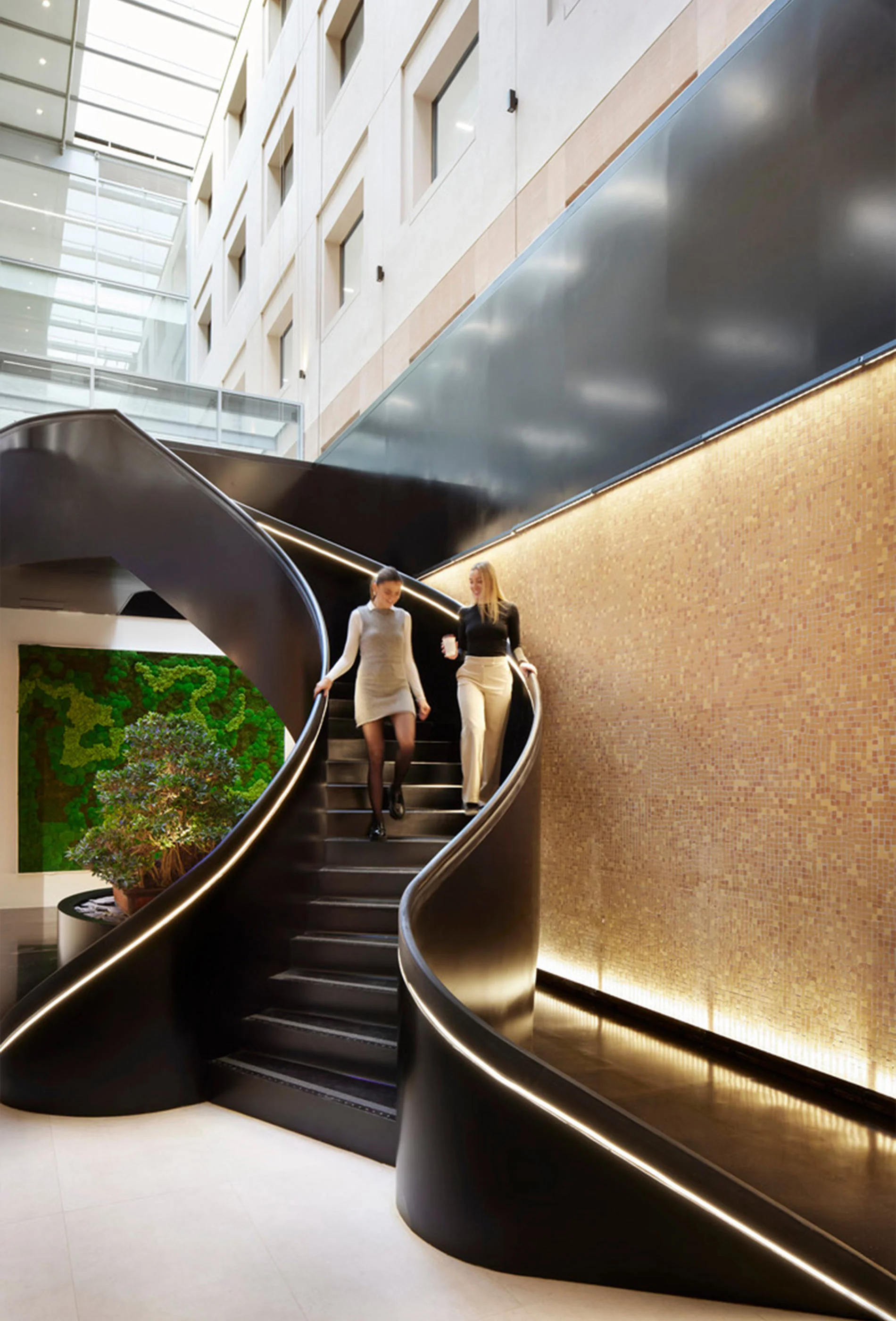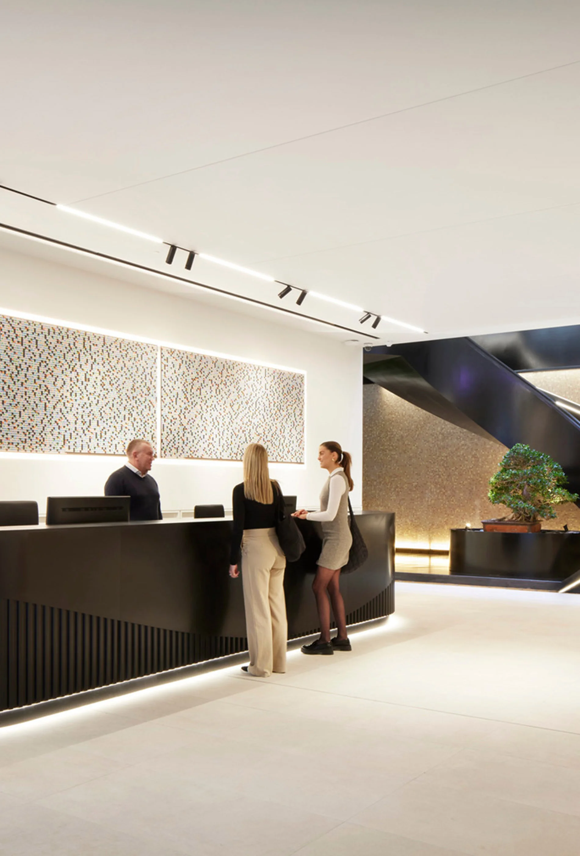 La reception accoglie i visitatori con una scenografica scala in metallo nero e boiserie in legno, arricchite da elementi biophilic come pareti verdi e bonsai che promuovono il benessere psicofisico.