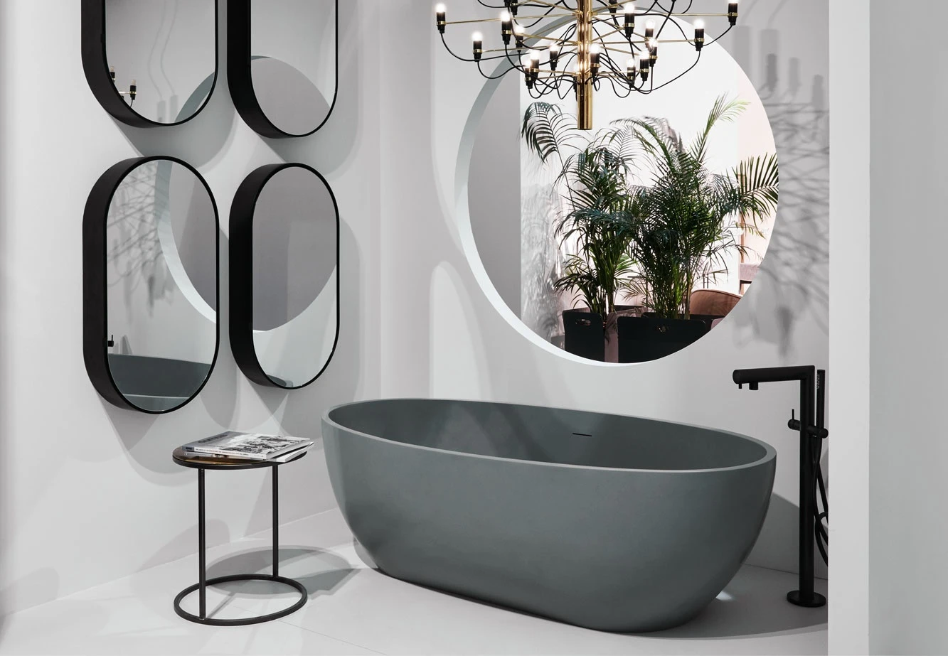 Экспозиция отличается использованием чистых и лаконичных линий — характерных черт, которые безошибочно определяют интерьер ванной комнаты.