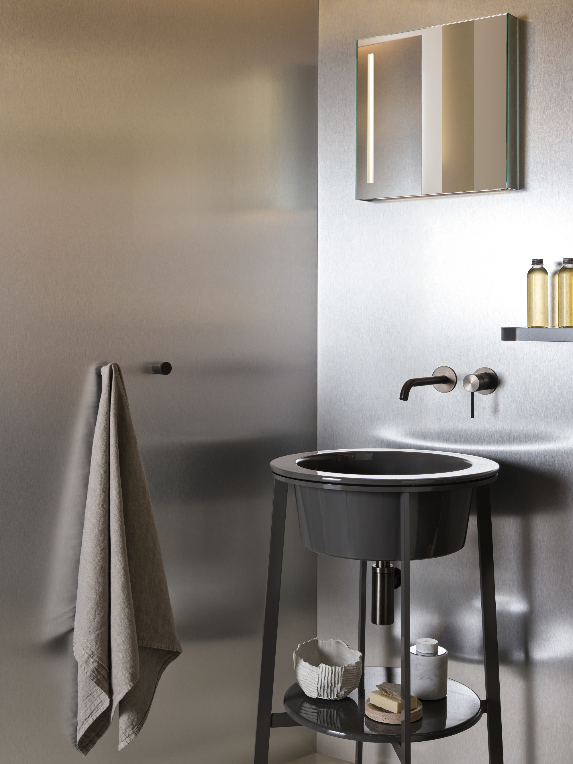 Композиция состоящая из: керамической раковины, доступной в различных отделках, структуры из крашенной стали в различных отделках и полочки из керамики или мрамора.