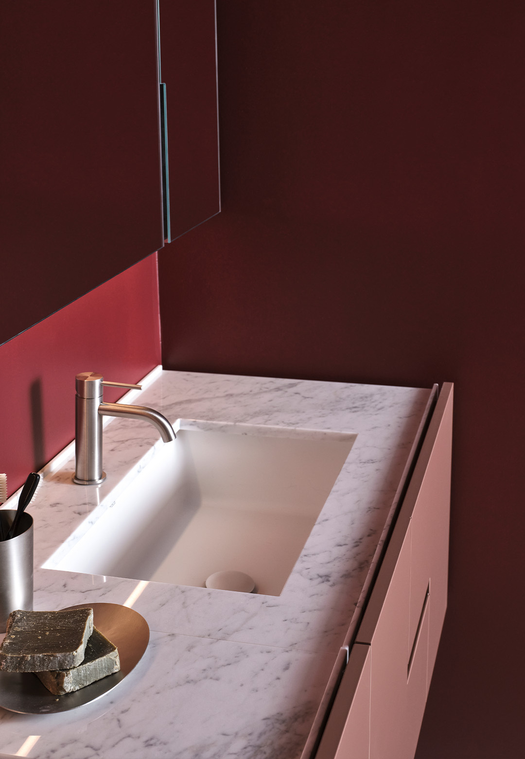 Раковина встроенная, с переливом, доступна в различных отделках.